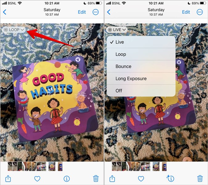 因此,打开实时照片并检查其左上角。它应该说Live。如果您看到类似“反弹”、“循环”、“长时间曝光”或“实时”按钮,但圆圈上有条形,则您将无法将实时照片另存为视频。点击下拉按钮并从菜单中选择直播。然后,尝试使用上述步骤将实时照片保存为视频。