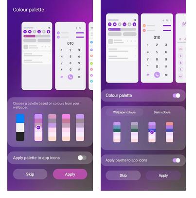 左 : 一个 UI 4 中 的 Material You 调色板。右 :一个 UI 5 的 Material You 调色板。