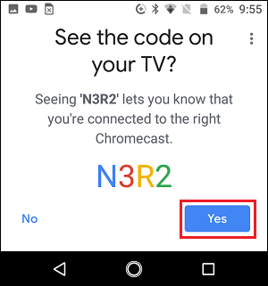 8.在下一个屏幕上,您会在电视右下角看到一个代码,在您的手机上看到一个代码。如果您能够在电视屏幕上看到相同的代码,请点击是。