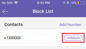 4.在阻止列表屏幕上,您将能够看到您在 Viber 上阻止的人员列表。从此列表中找到您要取消阻止的联系人,然后点击 位于联系人姓名旁边的取消阻止按钮。