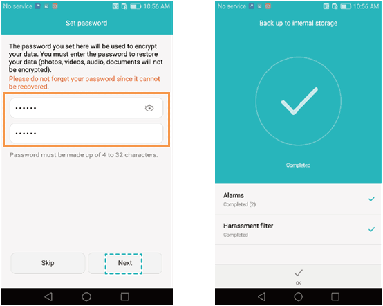 提示:如果数据中包含 通讯录、信息、通话记录,系统会提示您设置密码。设置密码后,点击下一步 ,或者如果您不想设置密码,可以点击 跳过 。