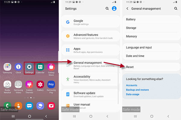 如果上述方法无法帮助您摆脱安全模式,您需要尝试将三星 Android 手机恢复出厂设置。但此方法会清除手机上的所有数据。所以您应该将重要数据备份到电脑或云盘上。