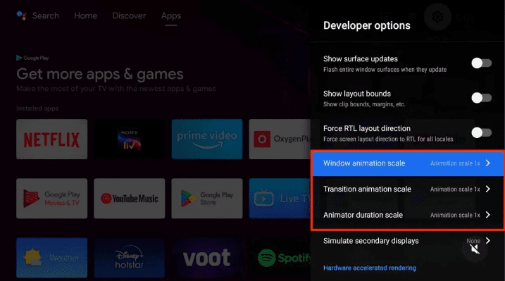 - 打开 “Animator 持续时间比例” 并将其设置为 “0.5x” 以提高 Android TV 盒子的速度。