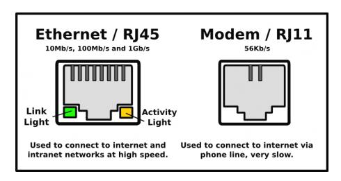 - 调制解调器/RJ11:通常用于端接电话线的物理接口。一旦成为每台台式电脑和笔记本电脑的标准问题,新电脑通常会没有调制解调器/RJ-11 端口,除非专门以这种方式订购。