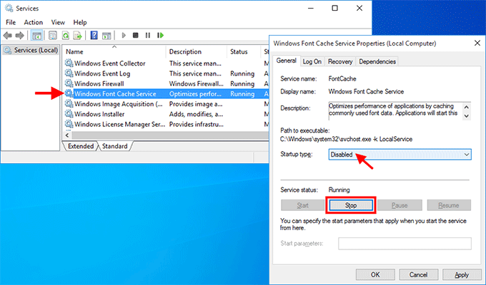 找到“ Windows Presentation Foundation Font Cache 3.0.0.0 ”服务。双击该服务以打开其属性对话框。同样,单击“停止”并选择“禁用”以停止并禁用该服务。单击“应用”保存更改。