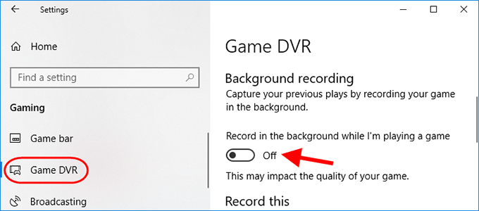 Windows 10 的游戏 DVR 功能会在后台自动录制视频,从而降低游戏性能。如果您不关心录制游戏过程,请禁用游戏 DVR 以获得更好的游戏性能。