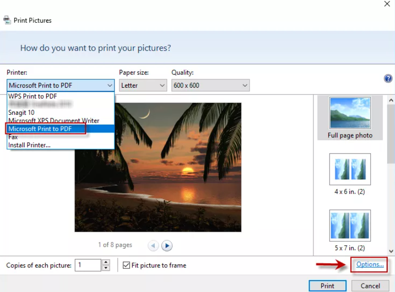 步骤 2:选择Microsoft Print to PDF,然后单击右下角的选项…。