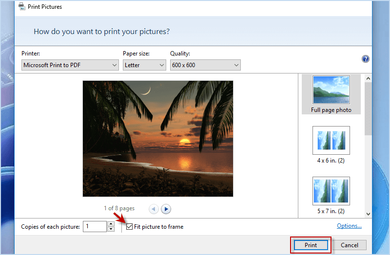 步骤 4:勾选“使图片适合框架”并点击“打印”按钮将 JPEG 文件转换为 PDF 文件。