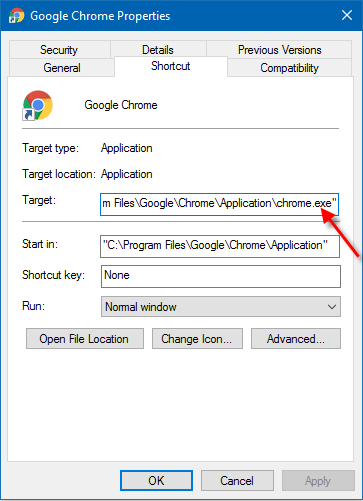 例如:“C:Program Files (x86)GoogleChromeApplicationchrome.exe”