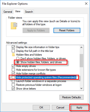步骤 2:选择“查看”选项卡。选中“显示隐藏文件、文件夹和驱动器”框,取消选中“隐藏受保护的操作系统文件(推荐)”框,然后单击“应用”。这将显示默认情况下隐藏的休眠文件。