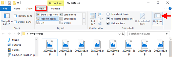 文件资源管理器允许您使用多种选项查看文件,包括超大图标、大图标、中图标、小图标、列表、详细信息、平铺和内容。您需要知道小图标、列表和详细信息不支持缩略图预览。因此,如果您发现图片缩略图未显示,第一步是检查文件资源管理器中的“查看”选项。确保使用支持缩略图预览的选项查看图片。