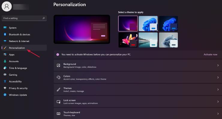 - 单击左侧窗格中的个性化。