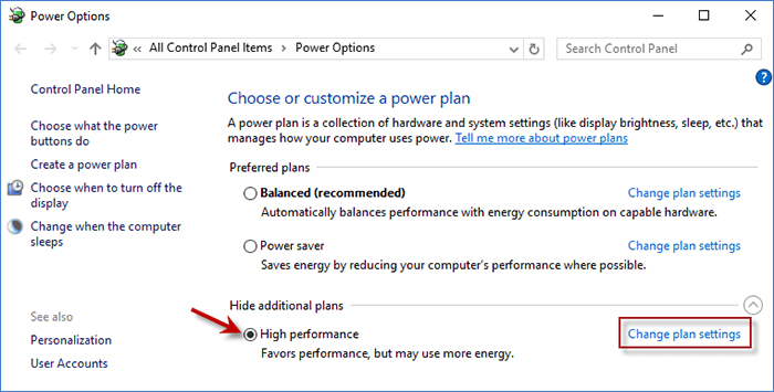 步骤 2:在“电源选项”窗口中,标记“ 高性能” 并单击“更改计划设置”。