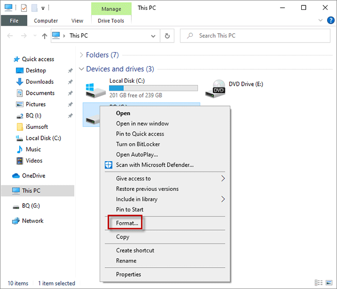 步骤 1:转到Windows 文件资源管理器,导航到需要格式化的目标文件驱动器。右键单击驱动器并从菜单中选择格式化。