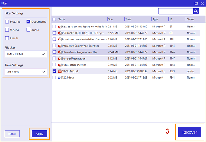 或者,如果您想快速找到已删除的 PDF 文件,请选择右上角的“过滤器”设置,如您所见。过滤器提供类型、大小以及删除文件时间的选择。勾选您要恢复的每个 PDF 文件,然后单击“恢复”按钮。