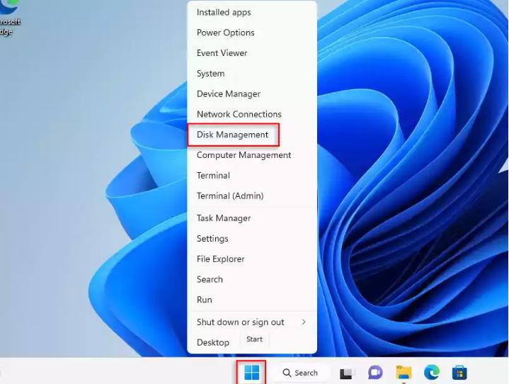 步骤 1:右键单击Windows图标并选择“磁盘管理”。