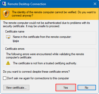 步骤 4:如果出现安全消息提示,请单击是确认此连接。