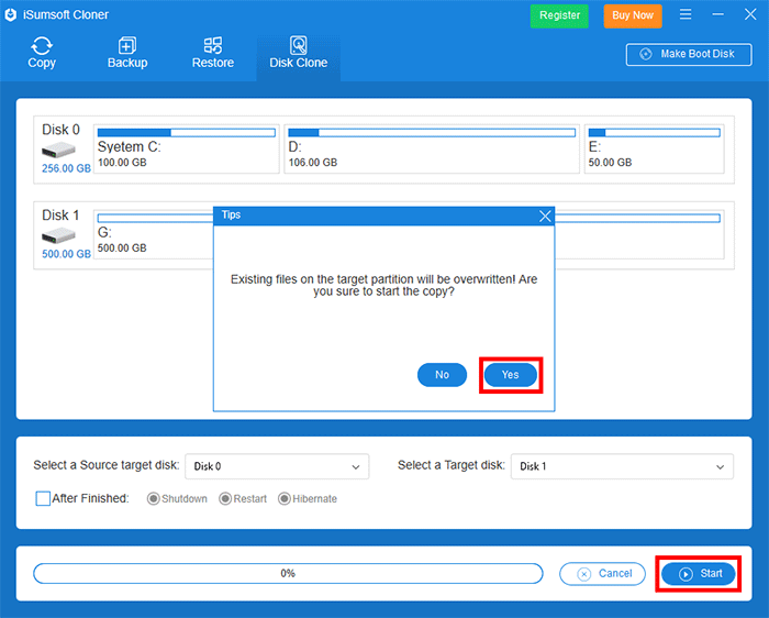 4. 单击“开始”按钮开始该过程。单击“是”开始克隆过程。
