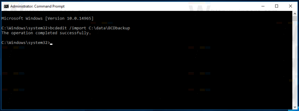 备份 BCD 存储后,您可以随时使用 bcdedit 工具恢复它。恢复过程也非常相似。您所要做的就是使用下面的命令并按 Enter: