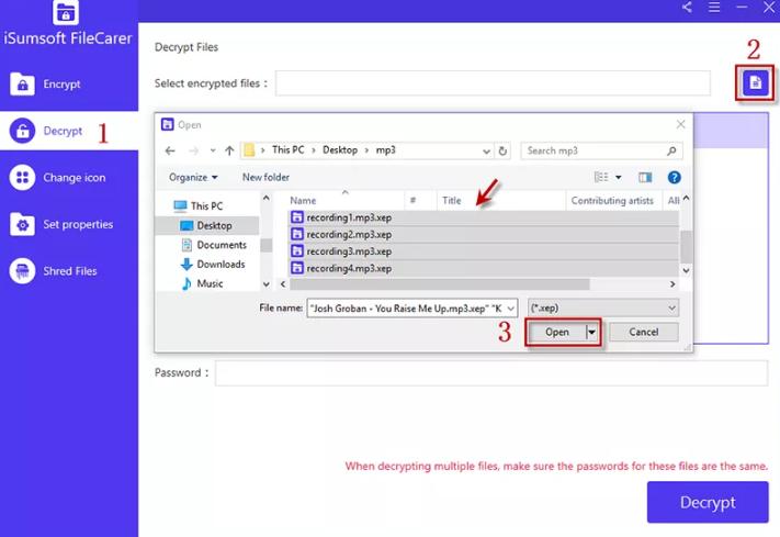 在 iSumsoft FileCarer 中,选择加密选项。然后单击文件图标,选择 mp3 音频文件并单击打开按钮将其添加到加密目录中。请注意,您可以按Ctrl + A键选择所有 mp3 音频文件。