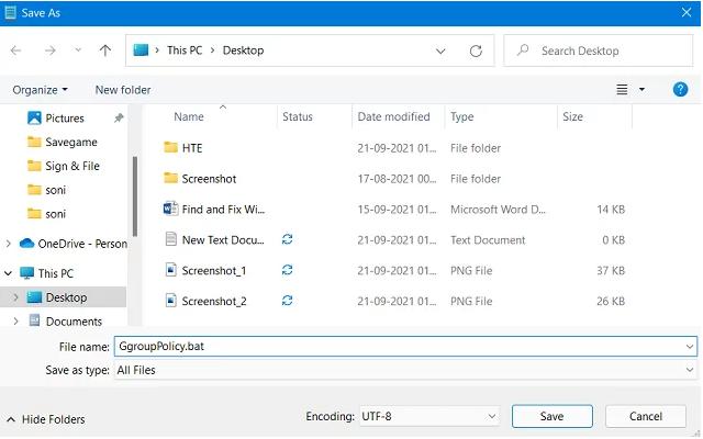 - 当系统提示保存该文件时,在“保存类型”下选择“所有文件”,在“文件名”下选择GroupPolicy.bat。您也可以提供其他名称。但是,请确保在其名称末尾添加“.bat”。