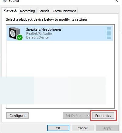 - 在 “播放”选项卡中,选择您正在使用的设备,然后单击“属性”。