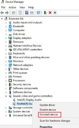 - 单击 声音、视频和游戏控制器,右键单击 Realtek(R) 音频 ,然后单击 卸载设备。