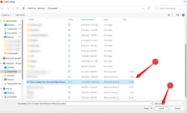 从此处找到您要使用的 Word 文档,选择它,然后单击“插入”。