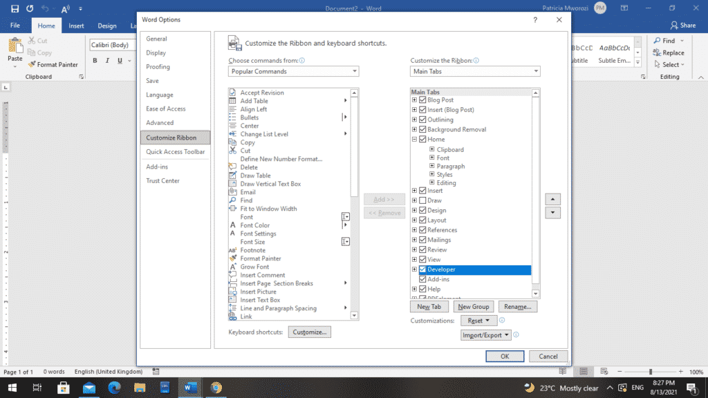 这是“自定义功能区和键盘快捷键”。在标题为“自定义功能区”的第二列下,选中“开发人员”旁边的框。