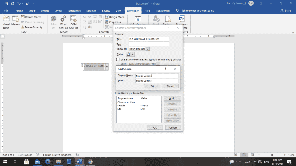 - 正如您所看到的,在我们的示例中,我添加了三个选择:健康保险、人寿保险和机动车辆保险。