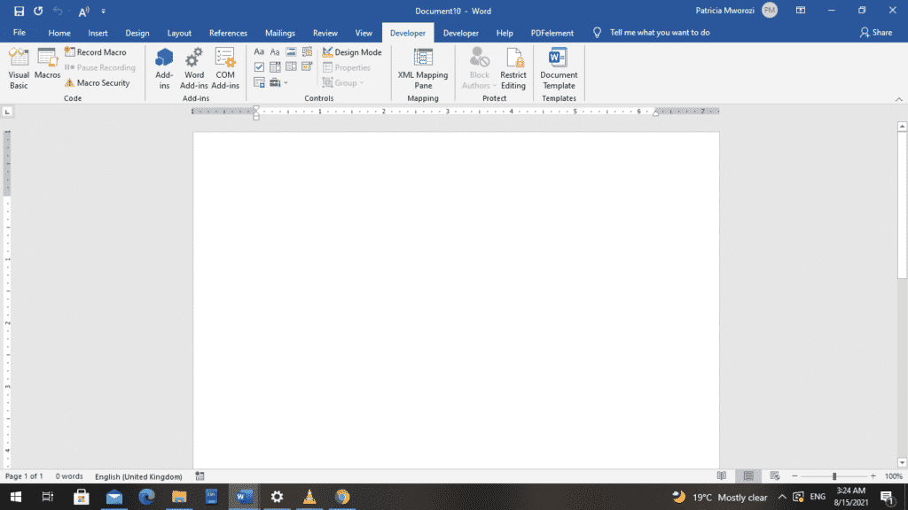 - 获得空白文档后,选择功能区上的“开发人员”。