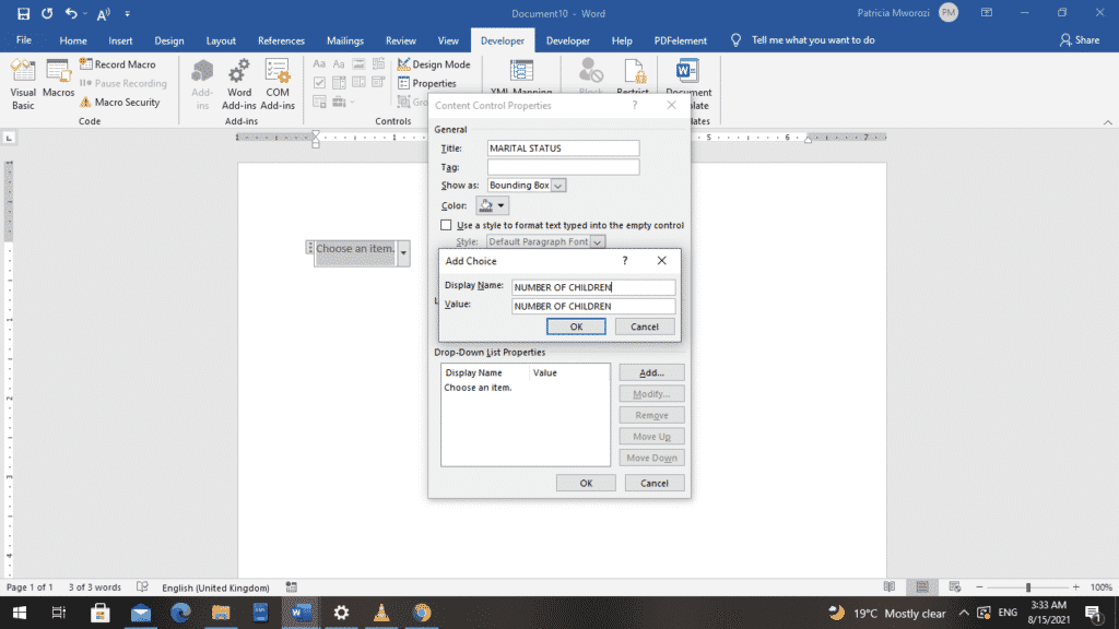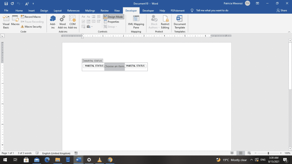 - 在设计模式下创建表单时,您将看不到下拉列表。但是,您可以选择“开发人员”选项卡下的“设计模式”将其关闭并测试您创建的下拉列表的外观。