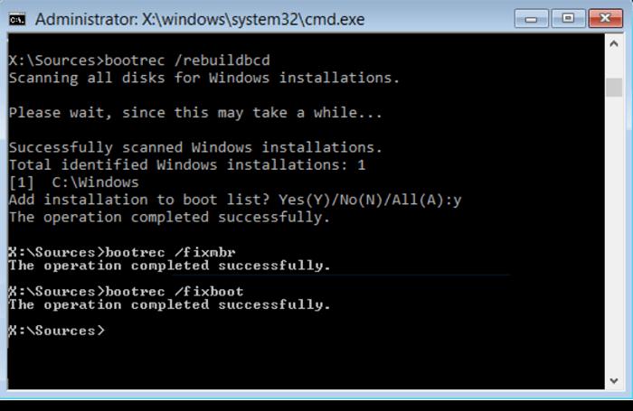 bootrec /FixMbrbootrec /FixBootbootrec /ScanOsbootrec /RebuildBcd
