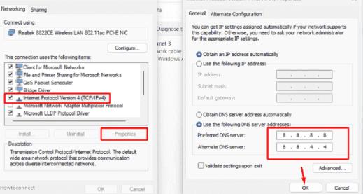 - 在下一个窗口中,选中选项 –使用以下 DNS 服务器地址。