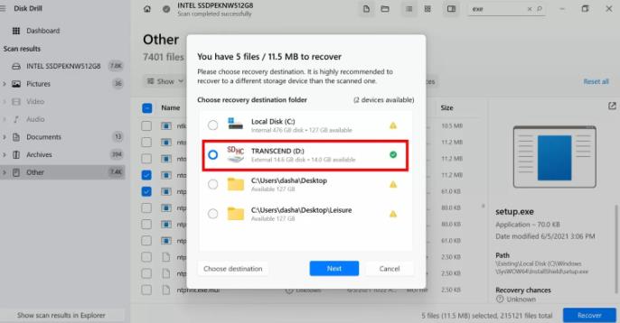 步骤 5.然后,系统将提示您选择一个存储位置来保存 Disk Drill 正在恢复的数据。请勿使用发生数据丢失的同一磁盘,以防止覆盖或损坏您要恢复的文件。