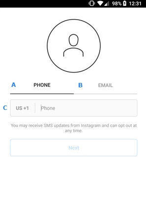 - 选择您想要使用电话( A ) 还是电子邮件地址 ( B ) 进行注册,然后填写所需信息 ( C )。