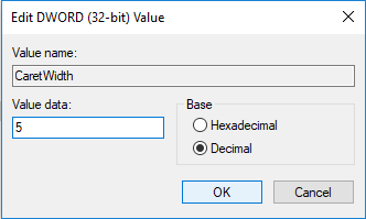 4.在“基数”下选择“小数”,然后在值数据字段中输入 1 – 20 之间的数字作为所需的光标粗细,然后单击“确定”。