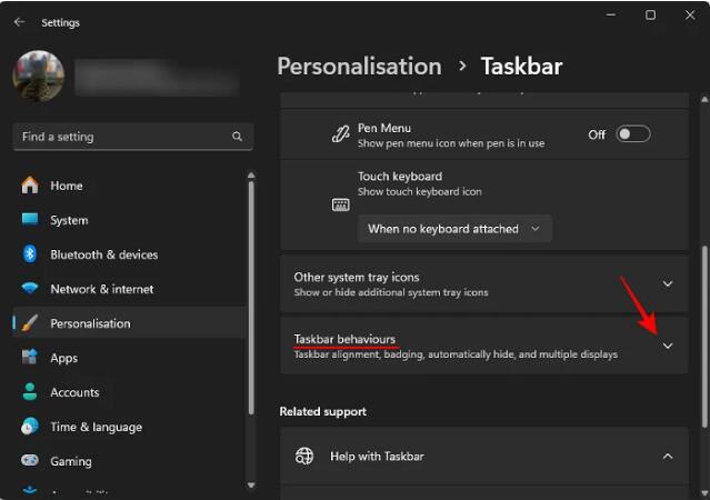 - 按Windows + i键盘打开“设置”应用程序。单击左侧边栏中的“个性化”,然后选择右侧的“任务栏”。