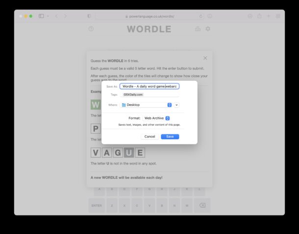 - 选择格式为“网页存档”并将其保存到 Mac 上的一个文件夹中,命名为明显的名称,如 WORDLE