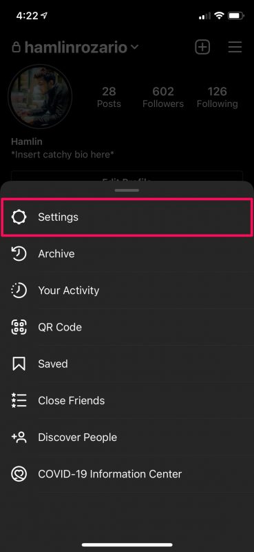 - 这将弹出一个弹出菜单。现在,点击“设置”来管理您的 Instagram 设置。