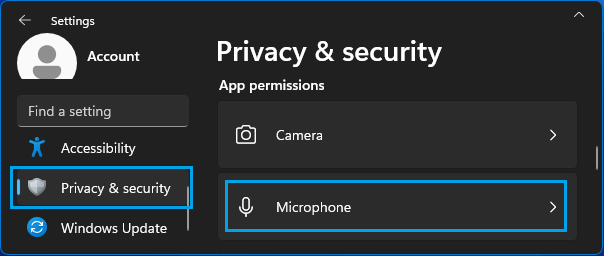 打开设置>向下滚动并单击左侧窗格中的隐私和安全。在右窗格中,单击麦克风。“应用程序权限”部分下的选项卡。