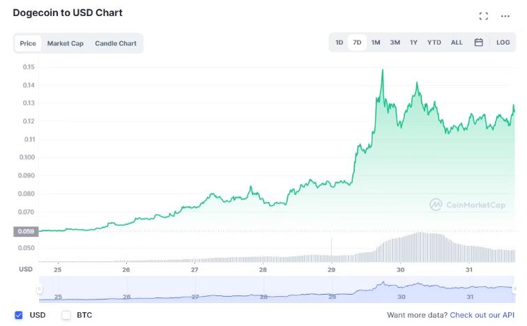 根据CoinMarketCap的数据,在马斯克收购 Twitter 之后,狗狗币在 48 小时内上涨了约 120%。尽管其他加密货币市场也出现了类似的反弹,但到目前为止,狗狗币是引领这一趋势的顶级资产之一。