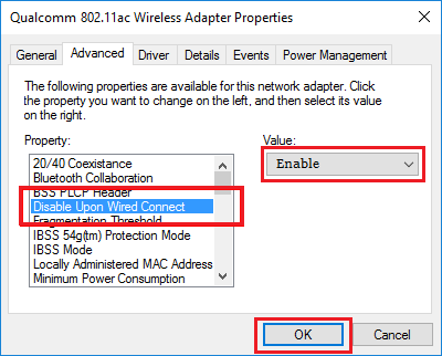 5.在下一个屏幕上,切换到“高级”选项卡,在属性框中选择“有线连接时禁用”选项,在“值”字段中将其值设置为“启用”,然后单击“确定” 。