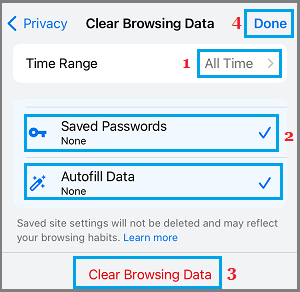 从设置屏幕,导航到隐私>清除浏览数据>在下一个屏幕上,选择所有时间作为时间范围,确保选择保存的密码和自动填充数据,然后点击清除浏览数据选项。