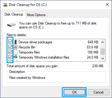 在磁盘清理屏幕上,选择所有项目并单击确定。