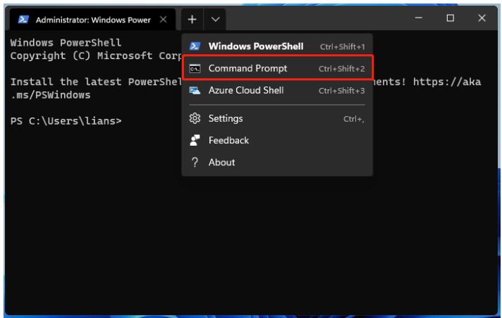 - 单击向下箭头图标并选择命令提示符。或者,按键盘上的CTRL + SHIFT + 2键启动命令提示符。