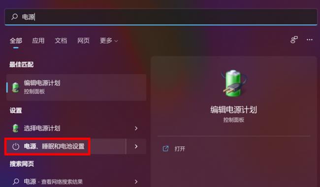 在Windows搜寻栏输入并点击打开[电源、睡眠和电池设置]。