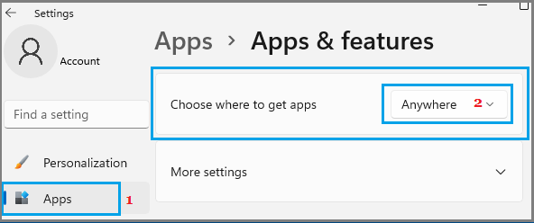 转到设置>应用程序>应用程序和功能> 单击“选择获取应用程序的位置”条目旁边的向下箭头,然后选择任何地方或安装非 Microsoft 应用程序时发出警告选项。
