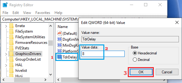 5.双击TdrDelay并在 Edit DWORD 弹出窗口中键入8作为“Value Data”。