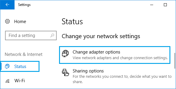 转到“设置” > “网络和 Internet ” > 在右窗格中向下滚动并单击“更改适配器选项”。